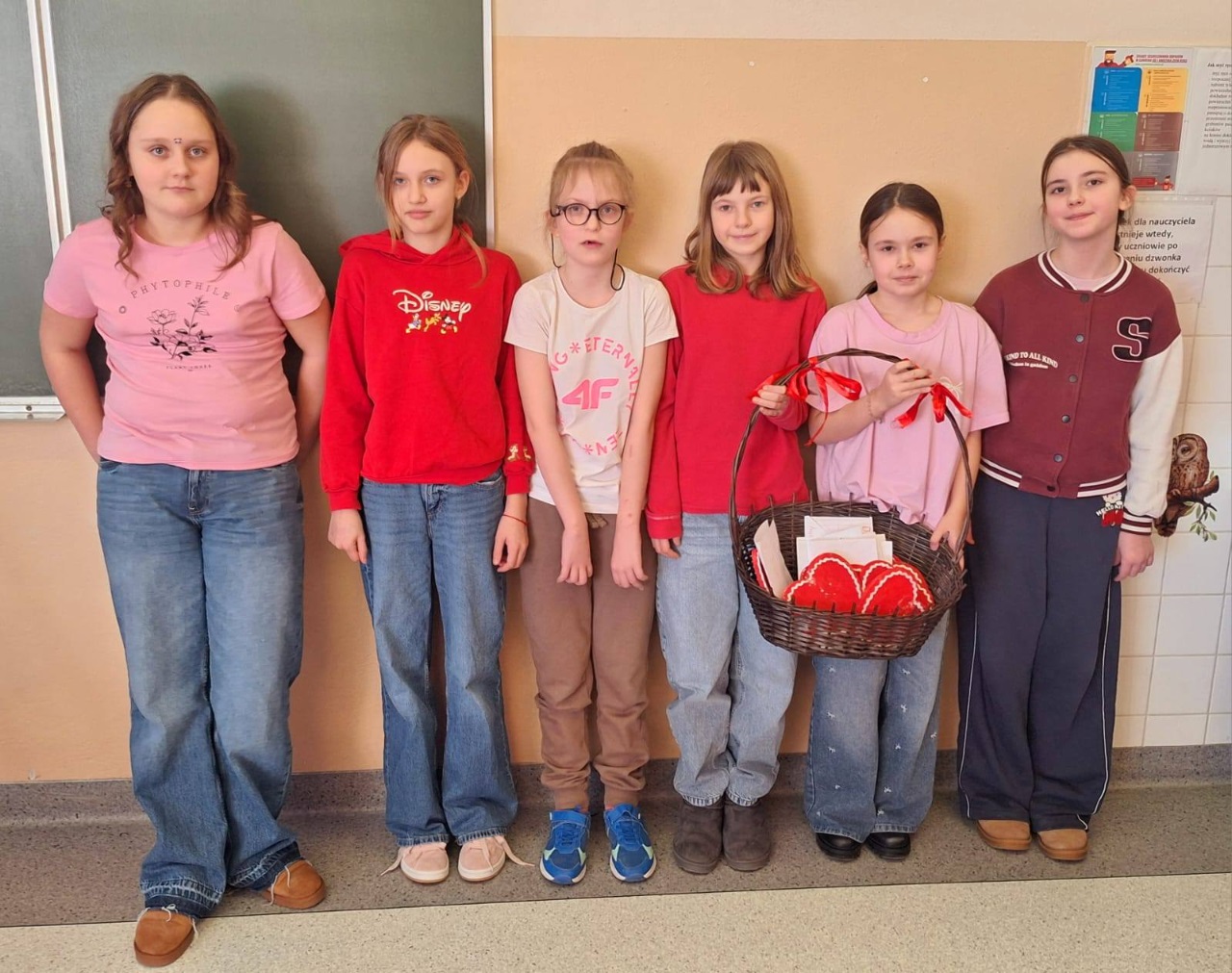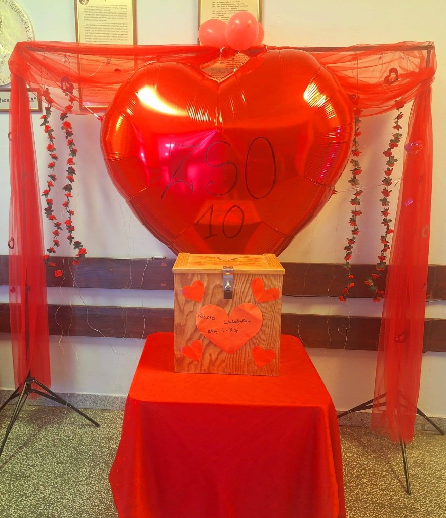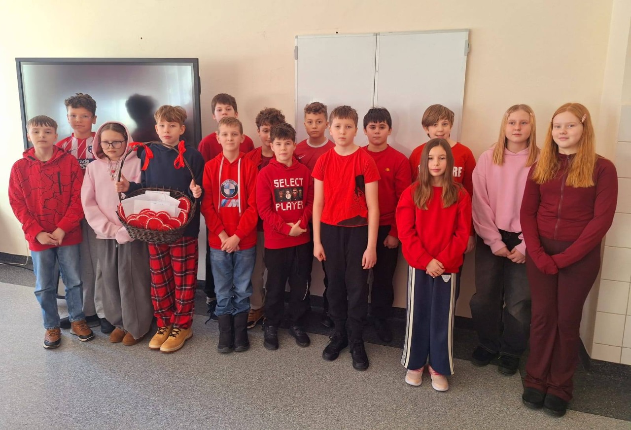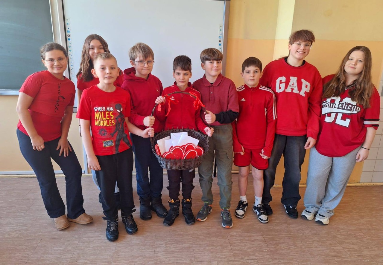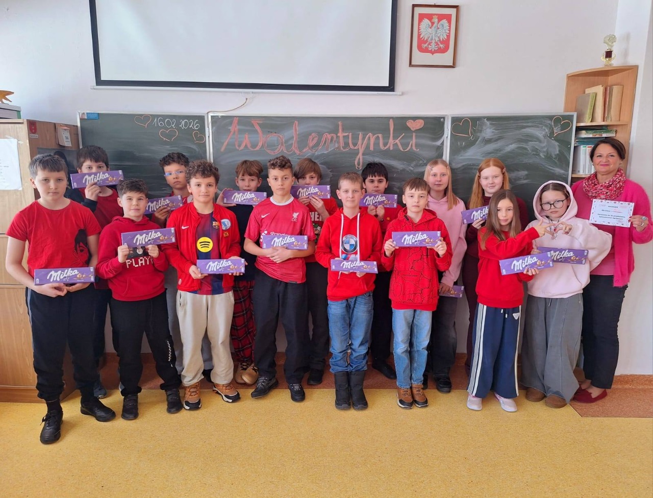 Od 09 do 12 lutego 2026r. uczniowie klas 4-8 SP mogli wrzucać do skrzynki walentynkowej liściki z miłym słowem, wyrazem sympatii. 16 lutego przedstawiciele Samorządu Uczniowskiego wręczali walentynki ich adresatom. Został ogłoszony konkurs na najliczniej przebraną klasę, w barwach czerwono-różowych.