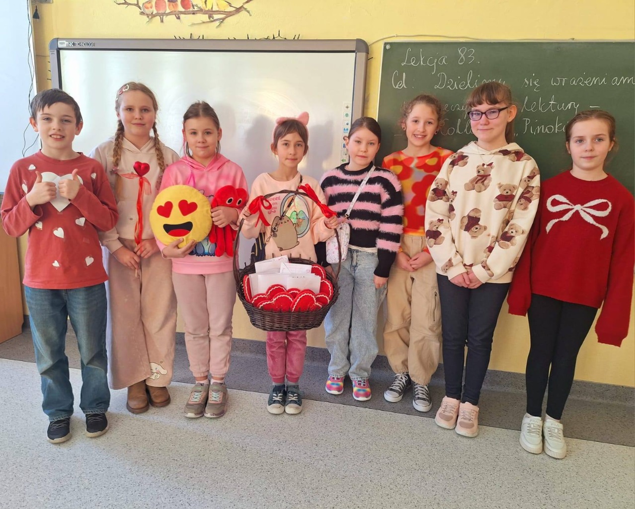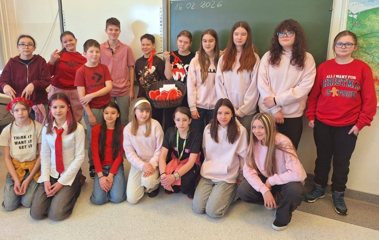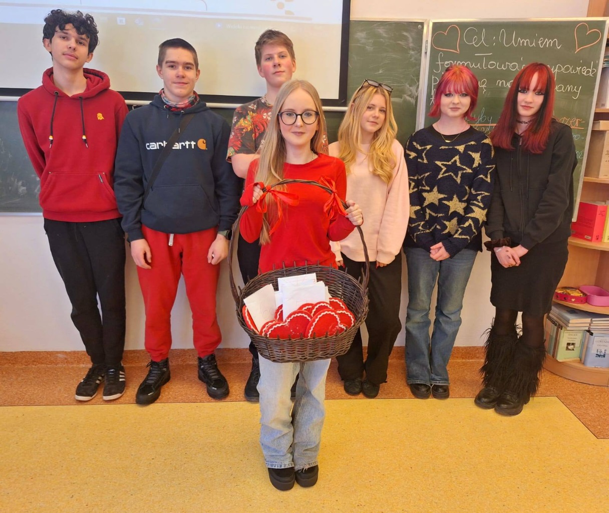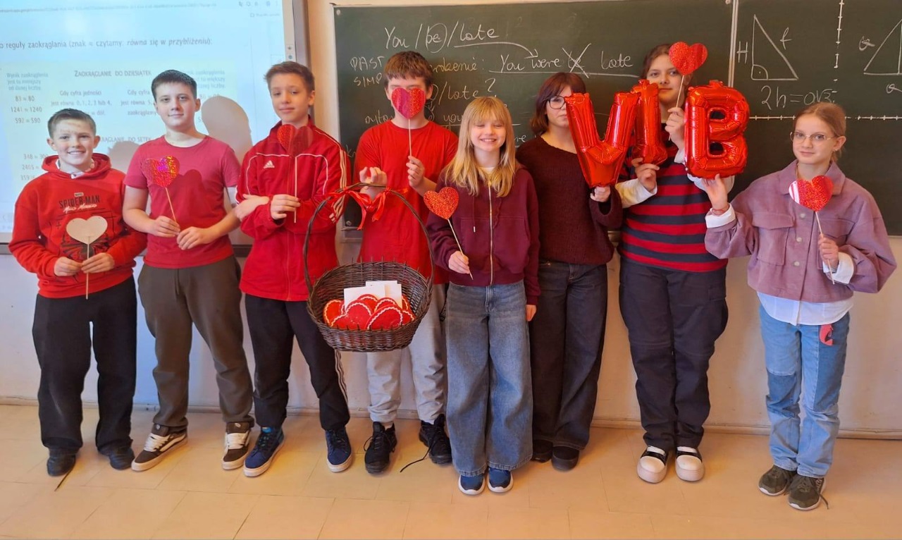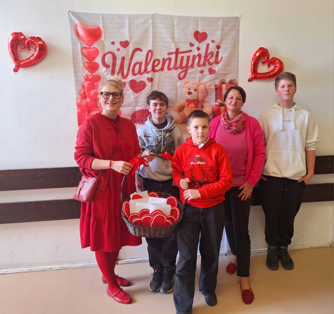 Od 09 do 12 lutego 2026r. uczniowie klas 4-8 SP mogli wrzucać do skrzynki walentynkowej liściki z miłym słowem, wyrazem sympatii. 16 lutego przedstawiciele Samorządu Uczniowskiego wręczali walentynki ich adresatom. Został ogłoszony konkurs na najliczniej przebraną klasę, w barwach czerwono-różowych.