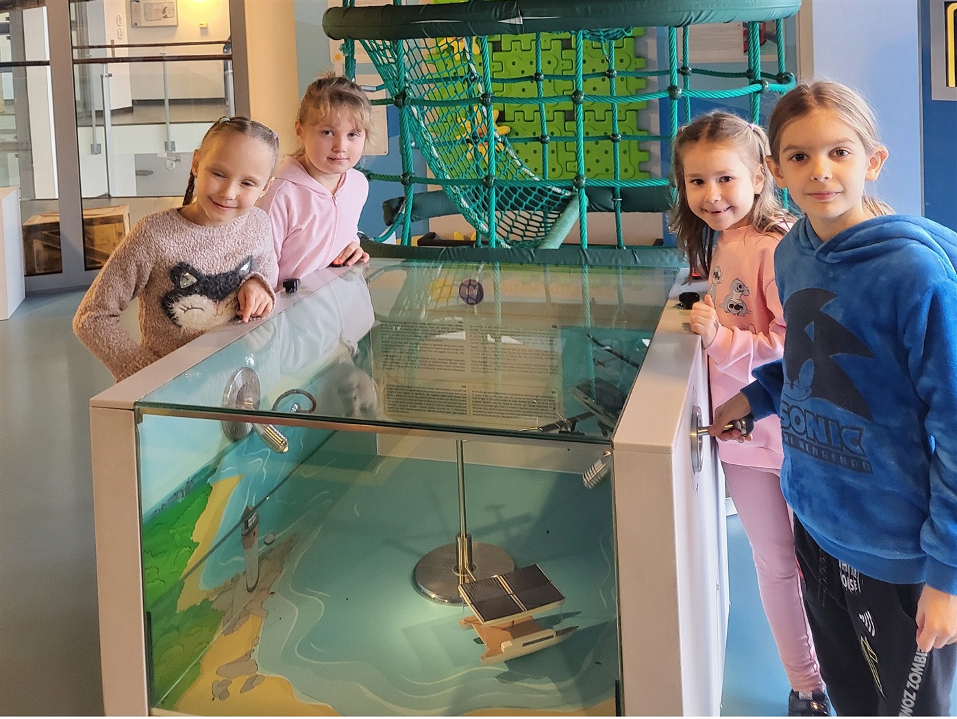 Po zajęciach warsztatowych uczniowie doskonale bawili się w interaktywnej sali muzealnej: sterowali statkami, robili załadunek i rozładunek okrętu, dowiedzieli się, jak powstaje tsunami, co może spotkać nurek w głębinach morskich itd. itd.